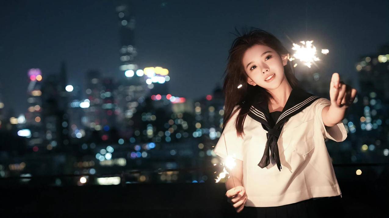 校服女孩 仙女棒 烟花 夜晚 城市 屋顶 4K精选美女高清壁纸