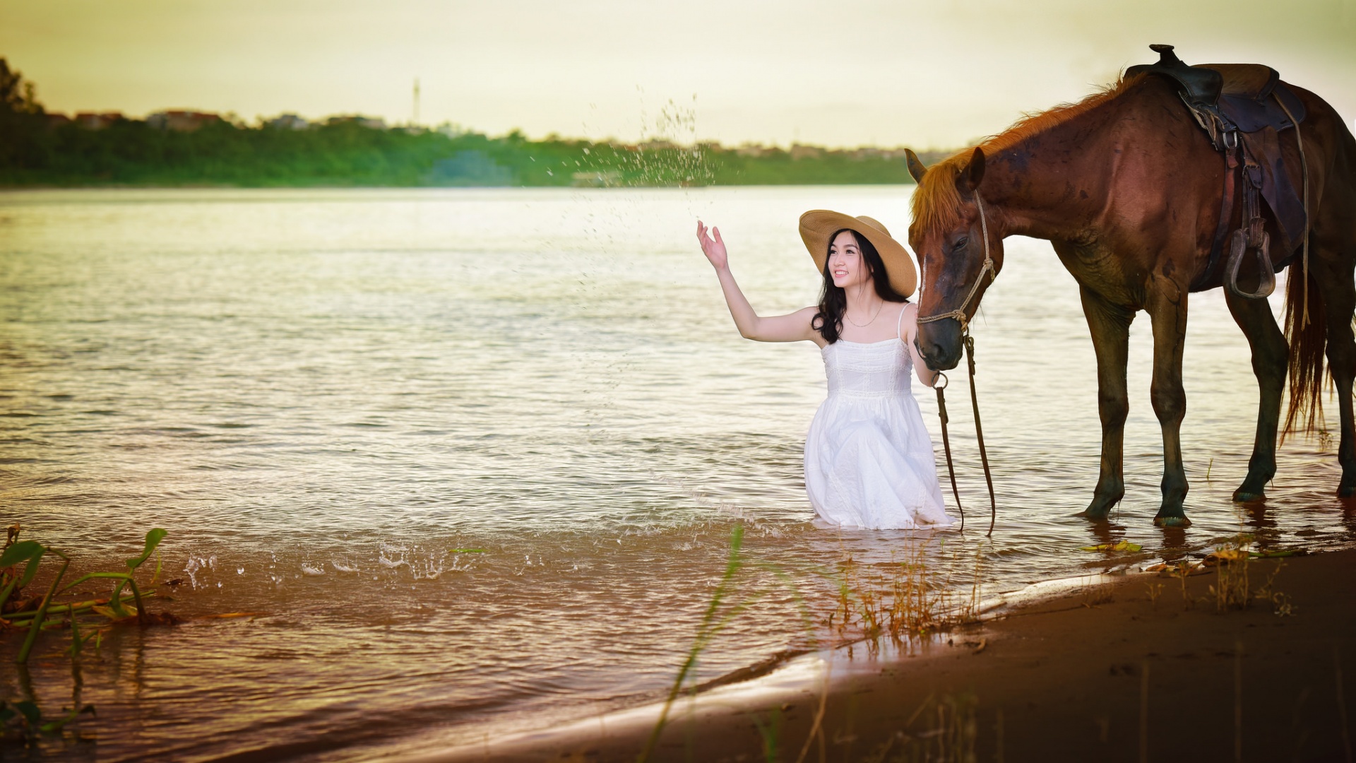 湖,微笑女孩,帽子,白色裙子,马,桌面高清壁纸