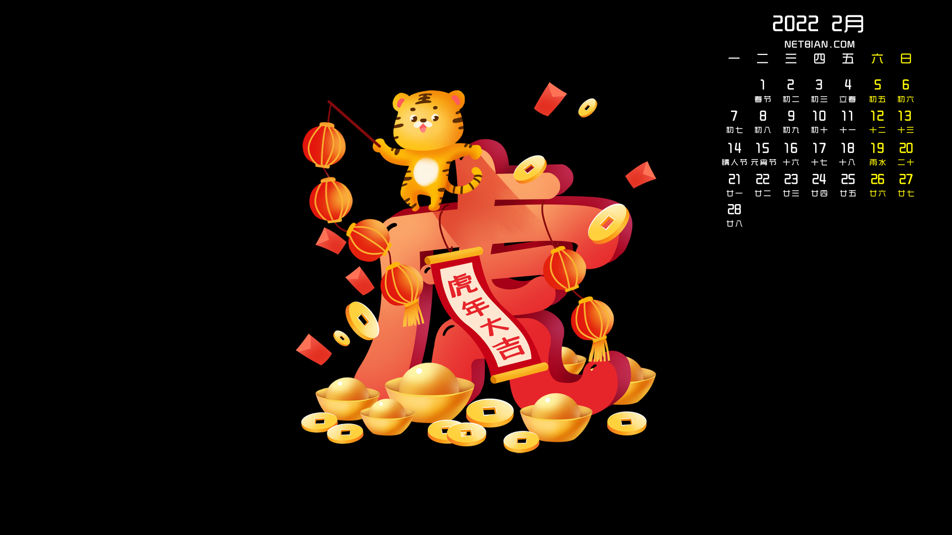 元宝 红包 灯笼 虎年大吉2022年2月日历桌面高清壁纸