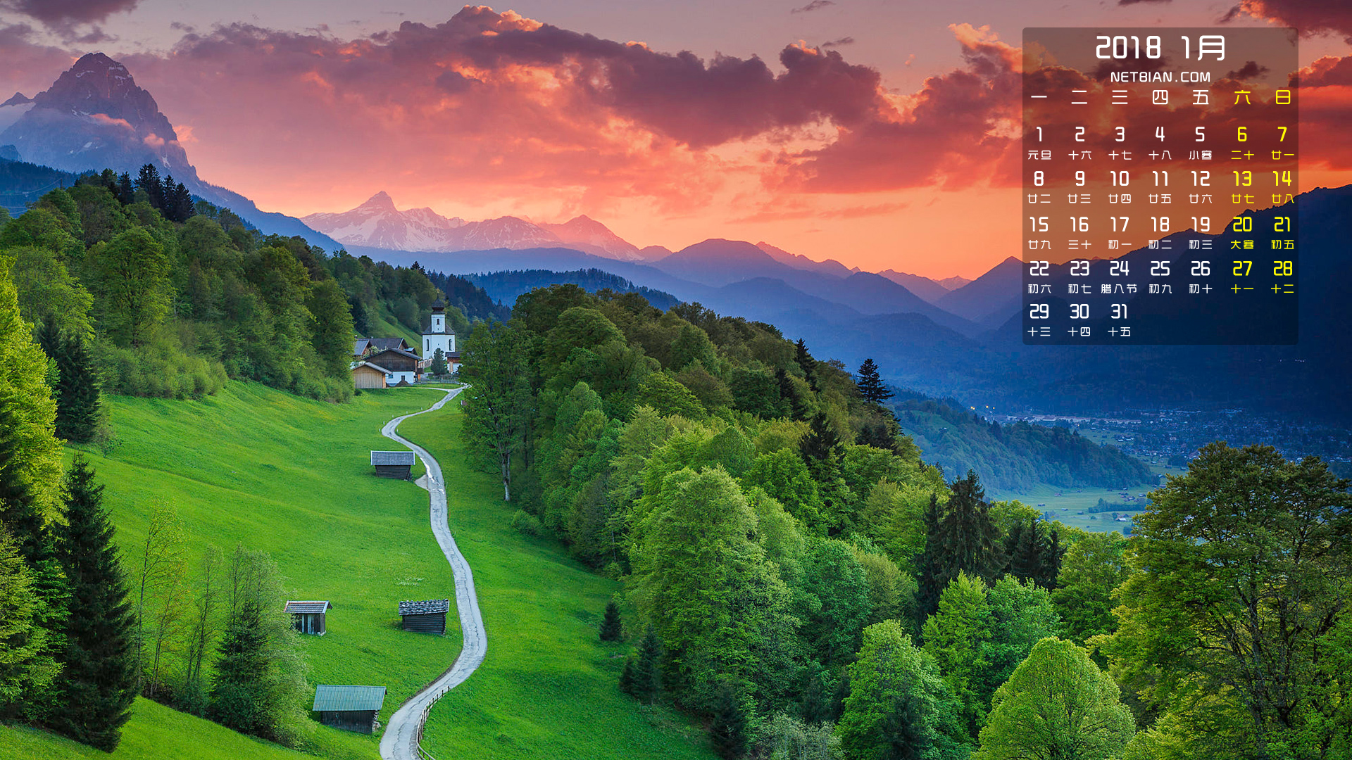德国巴伐利亚风景2018年1月日历桌面高清壁纸