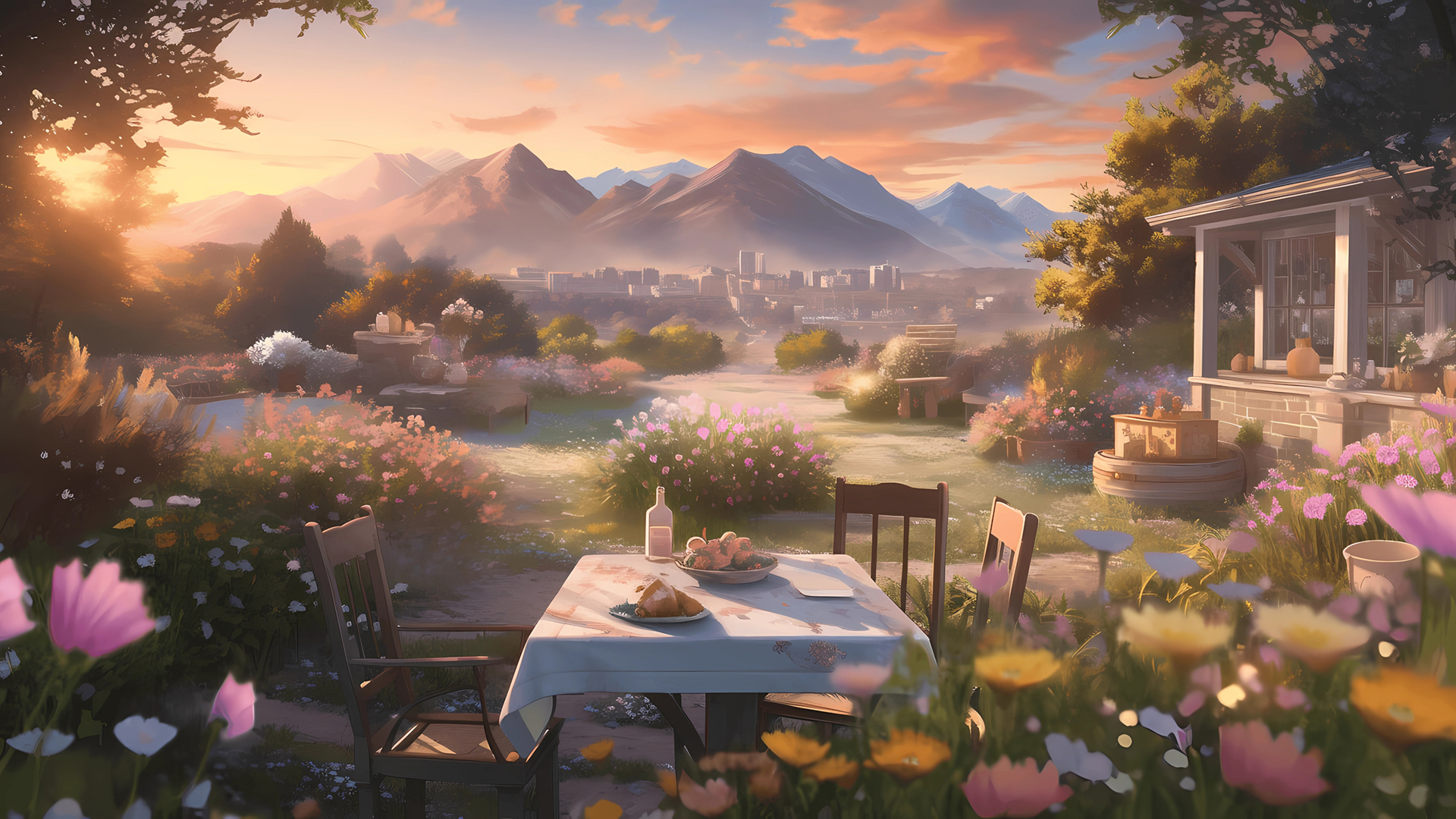 房子 鲜花 天空 云 夕阳风景桌面高清壁纸