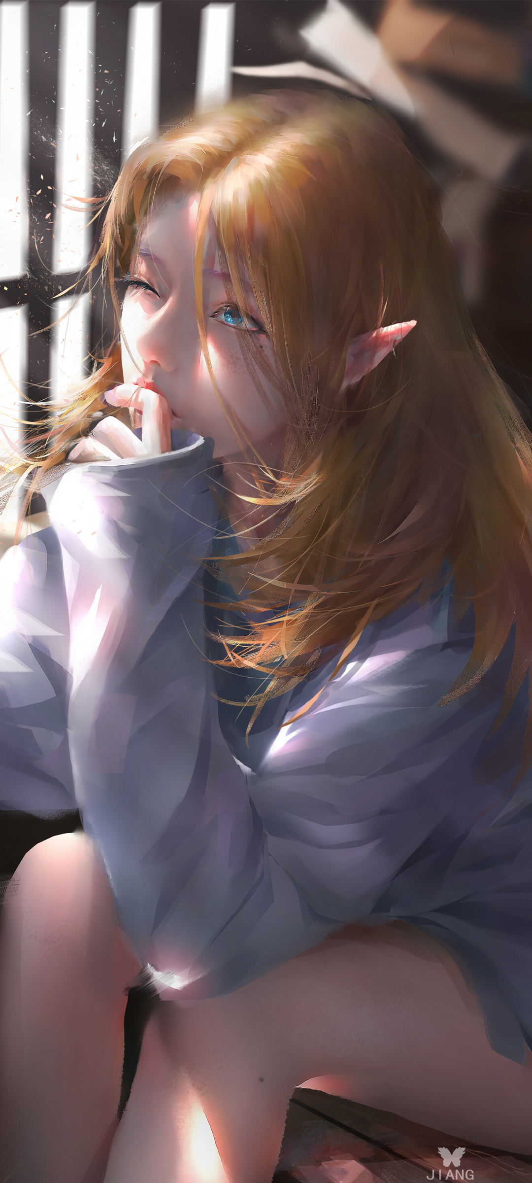女孩尖耳朵 棕色头发 蓝色眼睛 感受阳光 动漫美女全屏高清手机壁纸
